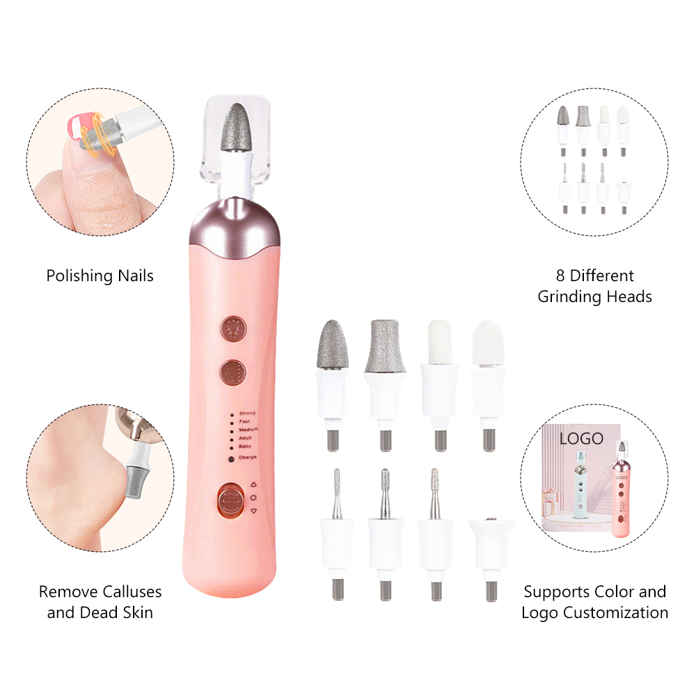 Multiple bits included: 8 interchangeable grinding/polishing heads for shaping, edging, callus removal, polishing, and cuticle/gap cleaning.