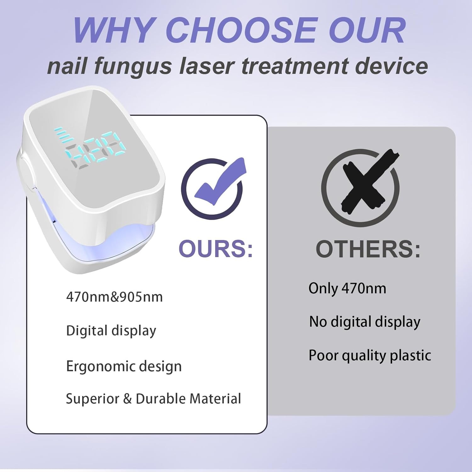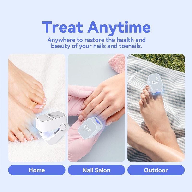 This is a mini portable phototherapy/laser nail treatment device using Dual Physical Light Technology (visible 470nm blue light + invisible 905nm near‑infrared/pulsed laser). It features an LED digital display and timer, a compact C‑shaped cavity to enclose the fingertip/toe for uniform irradiation, and is designed to assist in treating mild-to-moderate onychomycosis (nail fungal infection), disinfecting the nail surface, and supporting local repair.