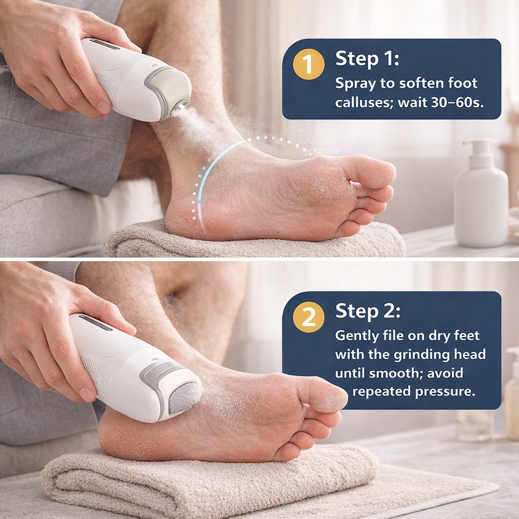 Painful Dry Grinding? Solved. The mist spray instantly softens hard calluses, allowing the grinding head to glide smoothly without causing irritation or heat buildup.