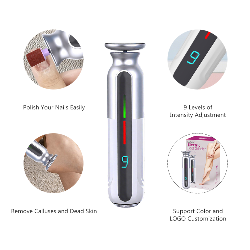 Showell Electric Foot Grinder — 2‑in‑1 callus remover and nail polisher with replaceable grinding heads, 9‑gear LED control, 1800mAh battery, Type‑C charging, and washable design. OEM/ODM support and one‑stop sourcing for retailers and brands.