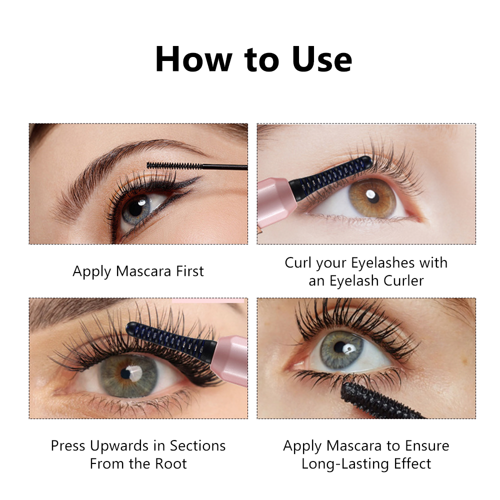 Curved Heated Brush Head — lifts and shapes lashes naturally without clamping or pinching.